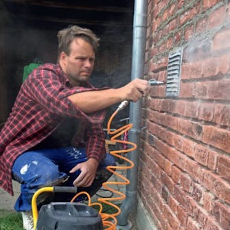 Fjern det siste kalksløret ved å avsyre murverket med en blanding av en del 30 % saltsyre til 20 deler vann. Får du ikke bukt med kalksløret, kan mengden saltsyre økes gradvis.