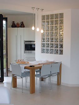 Du kan naturligvis også bygge rette murer med mørtel som halvmuren på dette kjøkkenet. Det kan se ut som to frittstående bein med ei plate oppå, men frittstående murer i glassbyggestein er ikke stabile nok - uansett om du bruker lim eller mørtel. Denne halvmuren har U-form og har dessuten kontakt til en murt halvvegg for at den skal bli stabil nok. Også når du murer med mørtel, må underlaget være plant for å få et godt resultat.