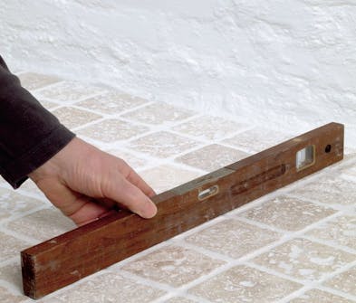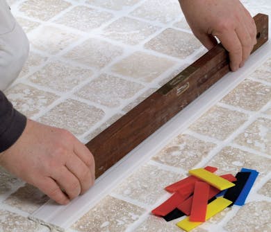 Er ikke gulvet helt rett, kan du klosse opp mellomlista med kiler slik at den ligger vannrett. Fyll etter med rikelig spesiallim. Er det mye lim under lista, skal limet herde et døgn før du bygger videre med glasstein oppå.
