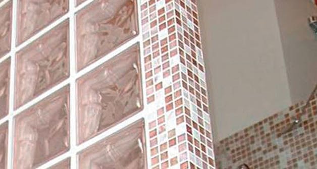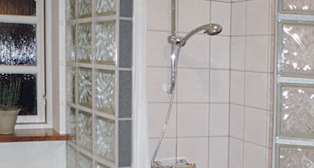 Skal glassmuren være buet som til denne dusjnisjen, er det nødvendig å bygge den opp med mørtel. Avstanden mellom de enkelte steinene vil jo være kort på den ene siden og større på den andre slik at lim og mellomlister ikke duger. Du kan da bruke en kalksementmørtel eller glassteinsfix.