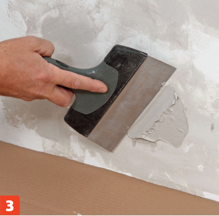 Veggen sparkles eventuelt jevn. Fyll først store hull med ny puss. Trekk deretter på sparkelmasse med en bred stålsparkel. Slip veggen helt jevn med slipepapir når sparkelmassen er tørr.