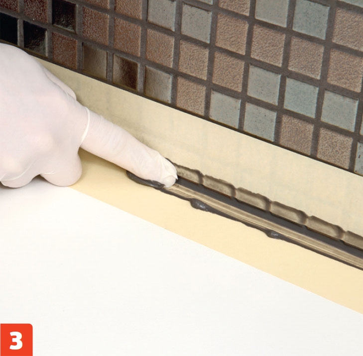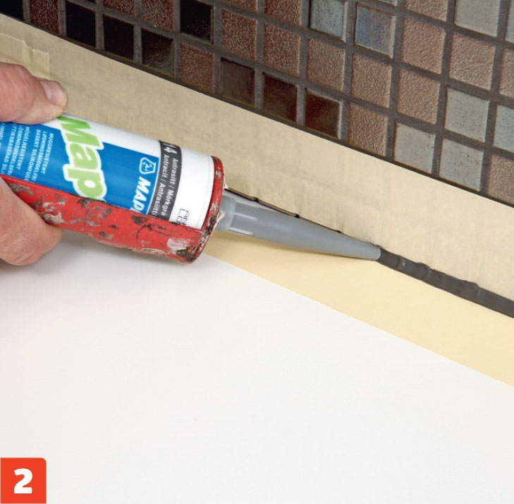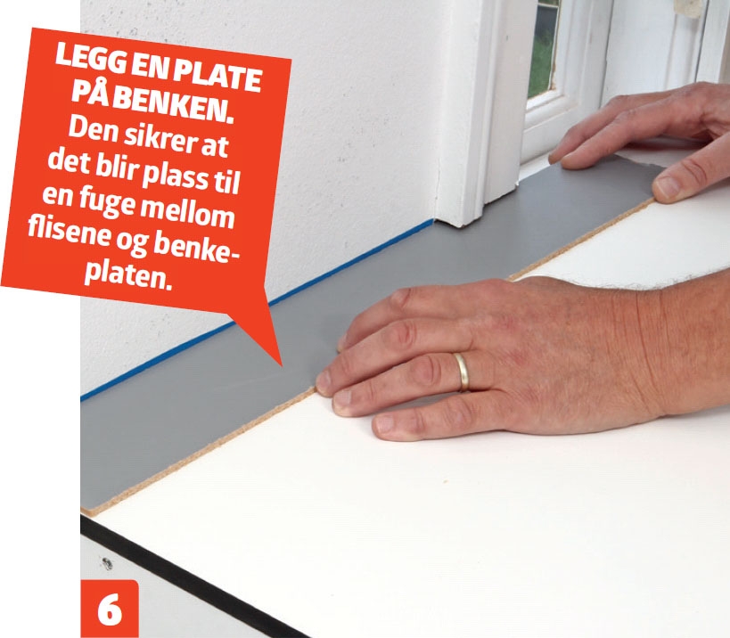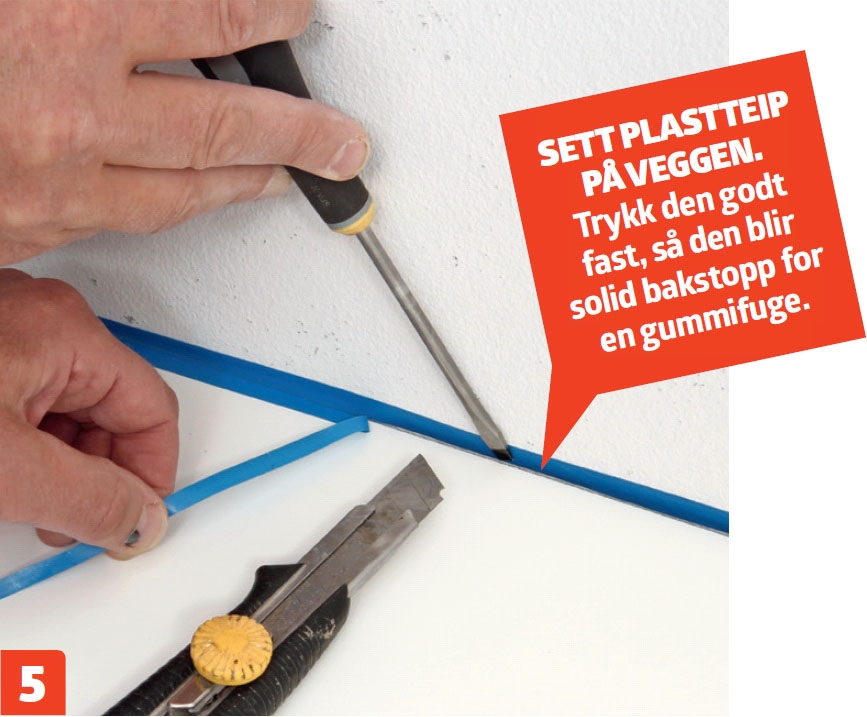 Sett fast en smal strimmel plastteip på veggen over benkeplaten. Den skal være ”bakstopp” for en elastisk gummifuge mellom flisene og benken. Den plasseres 5 mm opp på veggen og skjæres til.