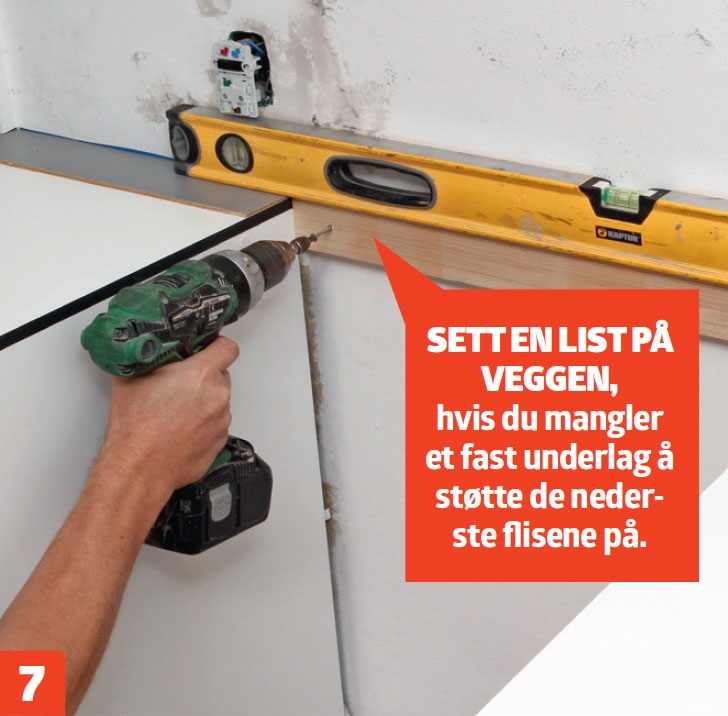 Skru fast en list på veggen i “hullet” til komfyren, slik at du får noe å støtte flisene på. Listen skal flukte med overkanten på masonittplaten på benken. Sjekk at listen sitter helt rett med et vater.