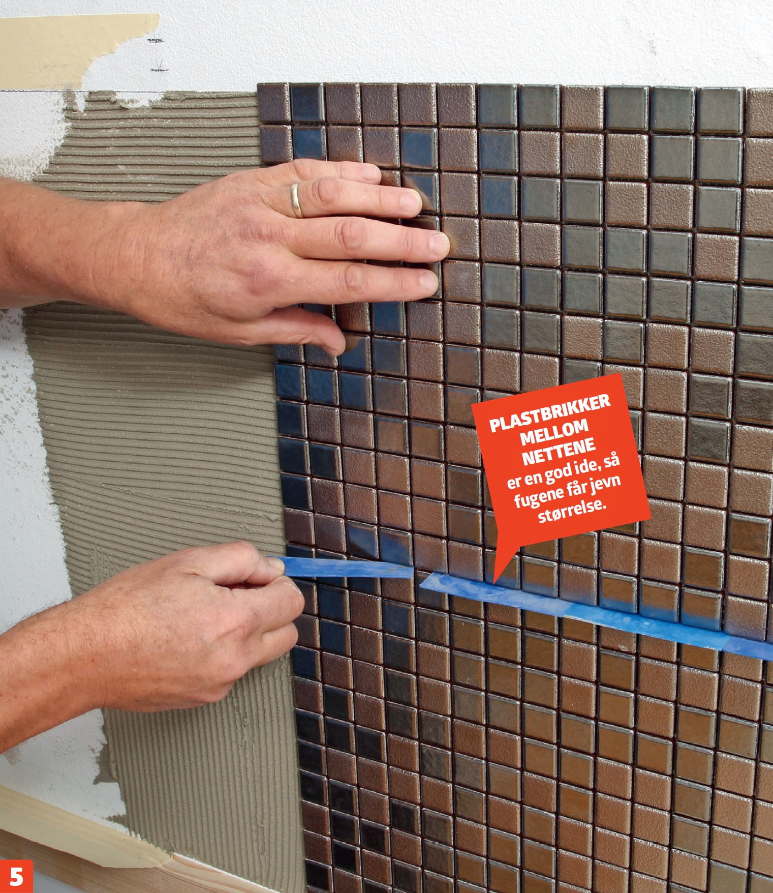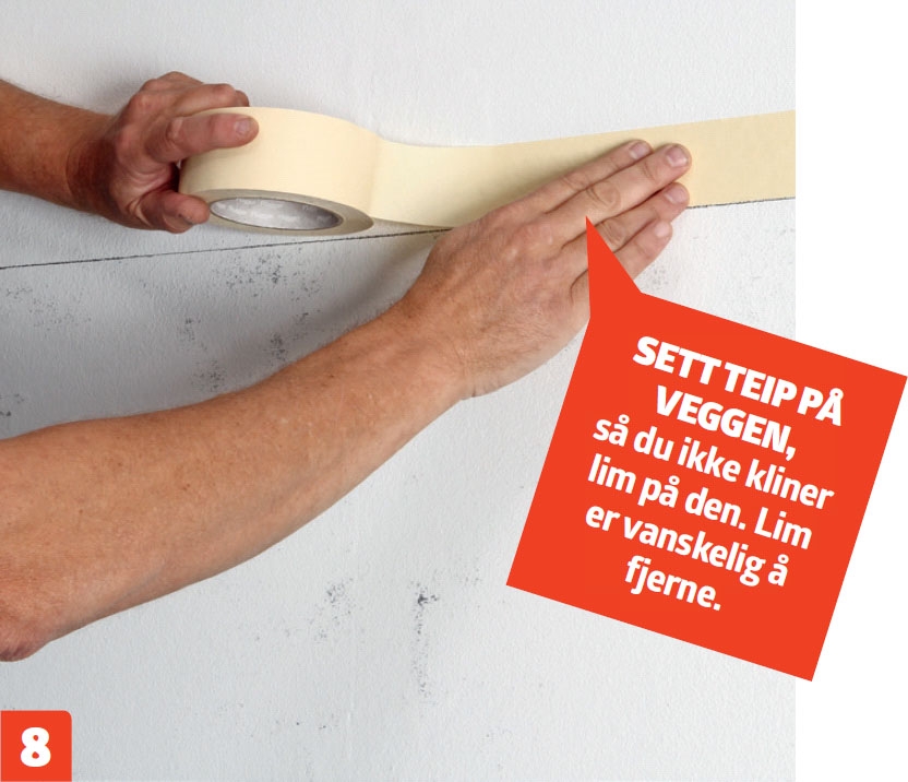 VIKTIG! Før du setter fliser på den øverste delen av veggen, er det viktig at du fjerner maskeringsteipen, ellers blir den vanskelig å få bort.