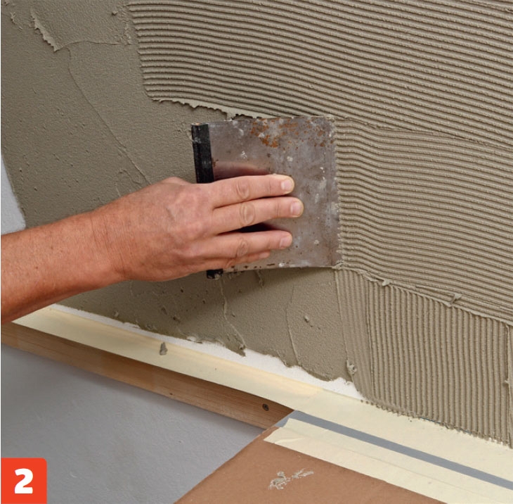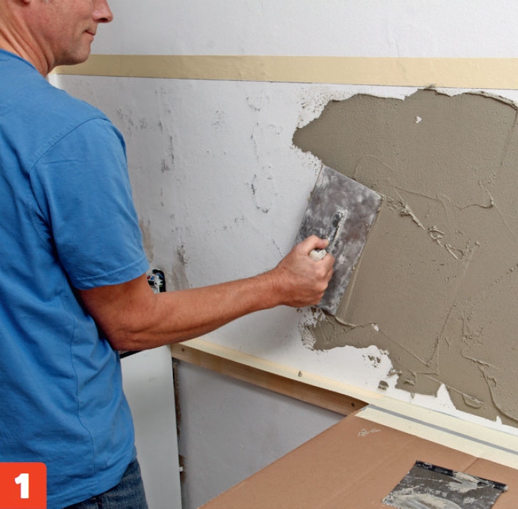 Trekk lim på veggen. Limet blandes med vann, og røres opp til en kremaktig konsistens, før det trekkes på veggen med et stålbrett. Det er en god idé å dekke til benken med papp eller aviser.