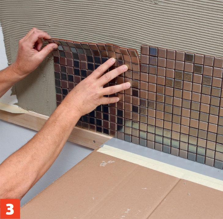 Sett den første rekken nett på veggen oppå masonittplaten, og trykk den fast. Juster fugene mellom hvert nett, slik at de blir like brede som fugene mellom de små flisene midt på nettet.