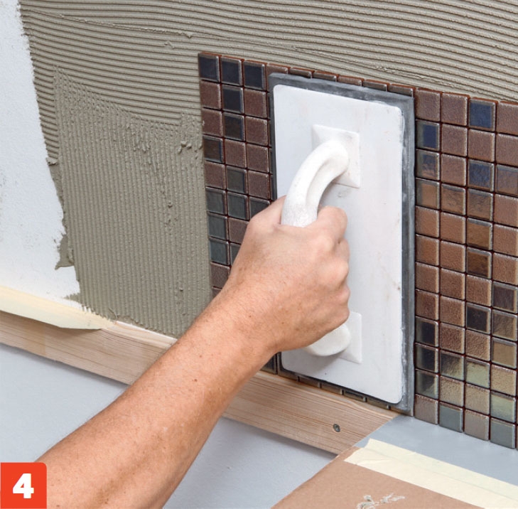Flisene trykkes fast i limet med et gummibrett, slik at overflaten blir helt plan. Ikke trykk så hardt at fugene mellom flisene blir presset fulle av lim. Det er viktig at det er plass til fugemørtel.