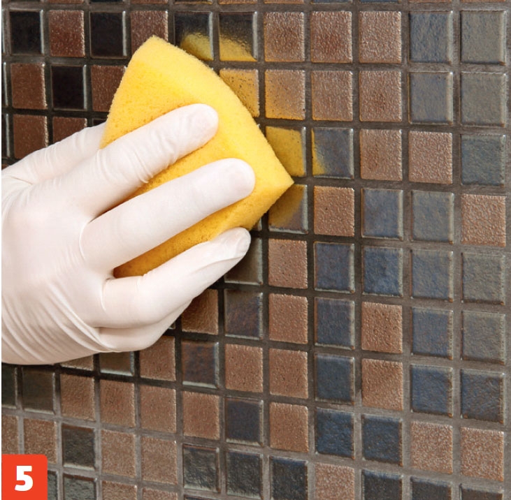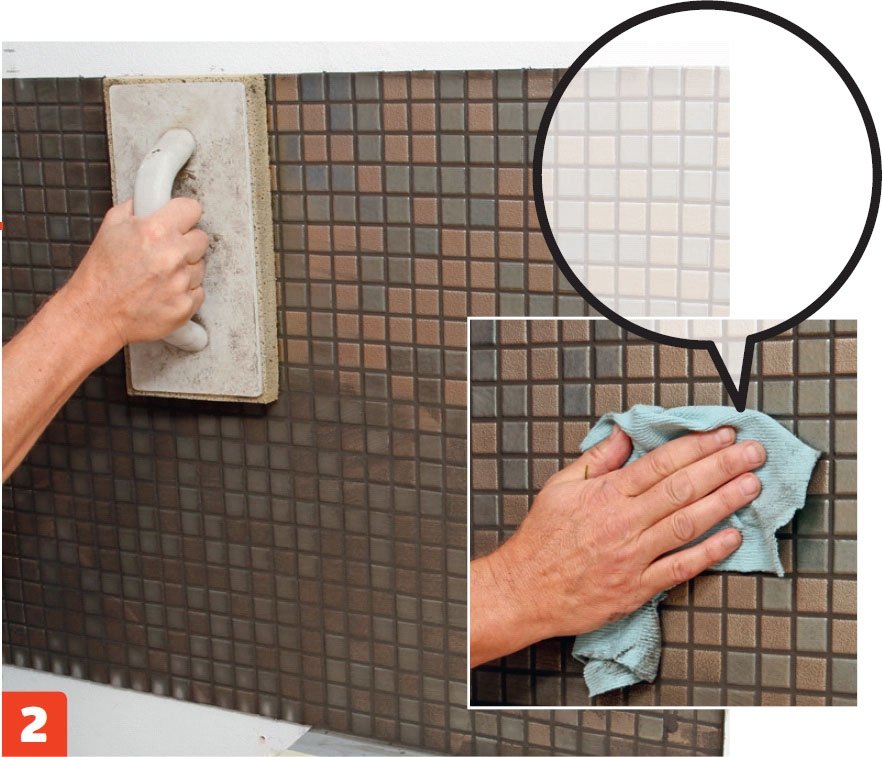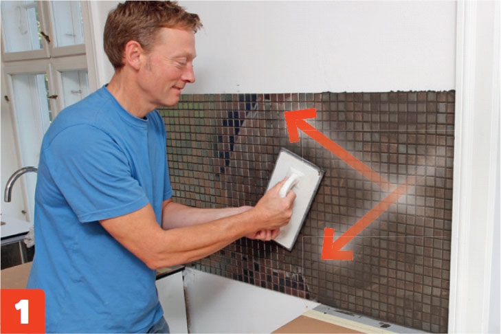 Fugemørtelen trekkes på med et gummibrett med diagonale bevegelser, slik at den kommer helt i bunn. Konsistensen på mørtelen er litt tynnere enn pisket krem.