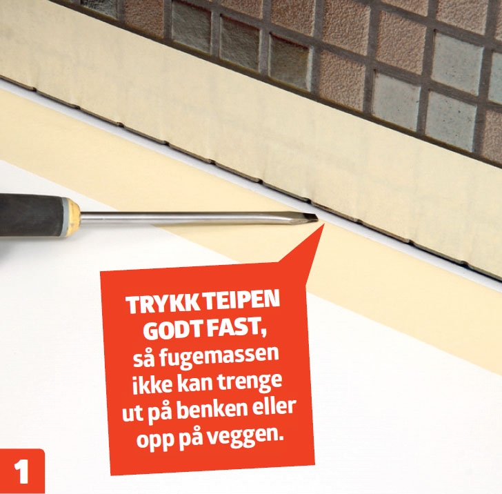 Sett bred maskeringsteip på begge sider av sprekken, og trykk den godt fast med en skrutrekker. Teipen på veggen plasseres 1 mm fra underkanten av flisene. På benken plasseres den 3 mm fra flisene.