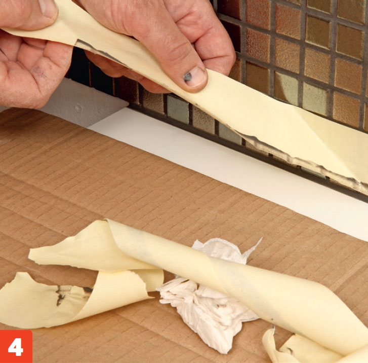 Teipen trekkes av så snart du har glattet fugen. Ha et pappstykke eller en avis klar til å legge den på.