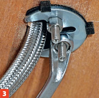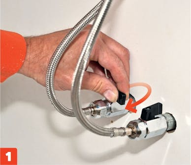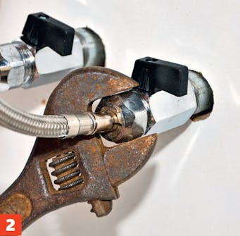 Kobberrørene/flexirørene skrus forsiktig løs, her fra kuleventilene. Sitter de godt fast, kan det bli nødvendig å holde kontra på ventilene/kuplingene mens du skrur.