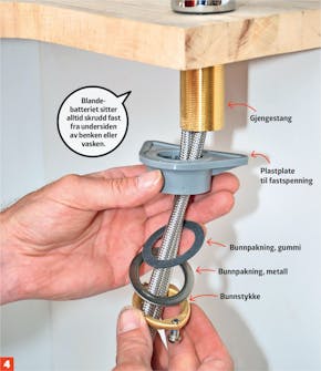 Monter det nye blandebatteriet der det gamle satt. Det er forskjell på hvordan de forskjellige blandebatteriene monteres, og her må du se på veiledningen som fulgte med til blandebatteriet ditt. I vårt tilfelle er det et blandebatteri fra Hansgrohe, som skal skrus fast på et langt gjengestykke med en spennplate og et par pakninger/skiver.