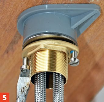 Til slutt sikres bunnstykket på det nye blande batteriet med et par små, kraftige skruer. I dette tilfellet måtte vi bruke en vanlig flat skrutrekker til formålet.