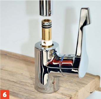 Det gamle blandebatteriet løsnes nedenfra og fjernes. Det kan være vanskelig å komme til. Men en fastnøkkel, en lommelykt og litt tålmodighet er alt som skal til.