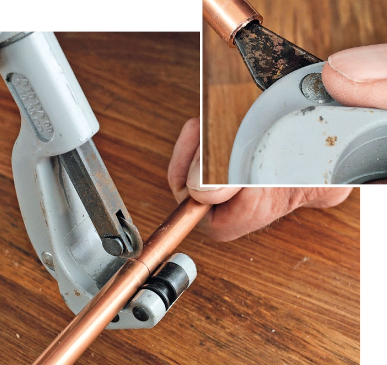 Når forlengerrøret skal kuttes til i lengden, skal du bruke en liten rørkutter for å unngå at røret deformeres. Drei rørkutteren rundt røret, og spenn justerskruen en kvart omgang hver gang du har vært “rundt røret”.