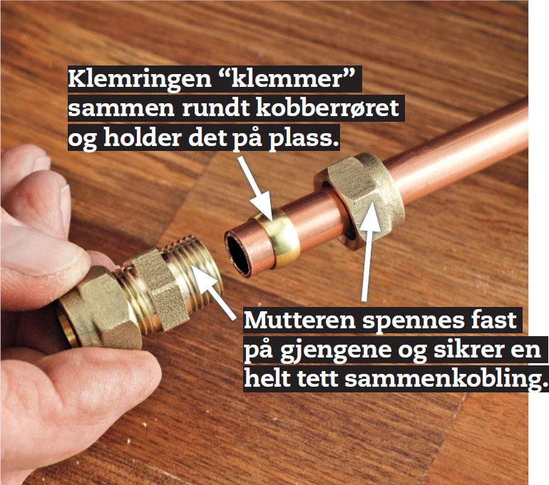Monter en klemringskobling i den ene enden av røret, og spenn til. Den skal bare akkurat “bite”, så unngå å spenne til for mye – det vil bare få ringen til å klemme for hardt på røret, med det resultatet at koblingen blir utett.