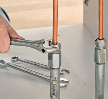 Fest så kobberrøret i bunnen til kuleventilene på den faste vanninstallasjonen. Også her er det om å gjøre ikke å overspenne, slik at du unngår utettheter i sammenkoblingen.