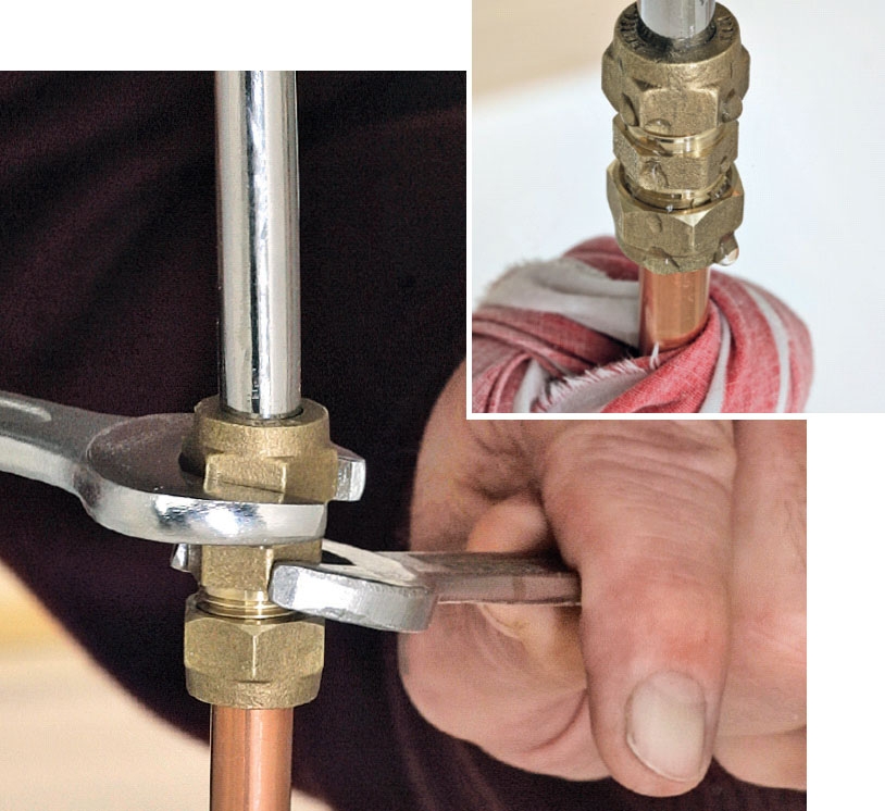 Når du spenner til i toppen, er du nødt til å bruke to nøkler; en til å skru og en til å holde igjen med. Til slutt sjekker du at det ikke pipler ut vann når du setter på vanntrykk. Skjer det, spenner du mutteren forsiktig til det stopper.