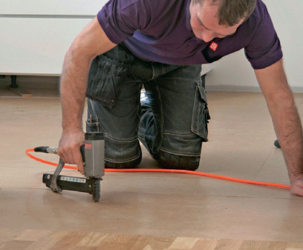 Når du skal legge et undergulv av masonittplater, for eksempel som underlag for et linoleumsgulv, er stiftepistolen smart. Det går mye raskere enn å spikre fast platene, og du kommer derfor raskere i gang med å legge selve gulvet.