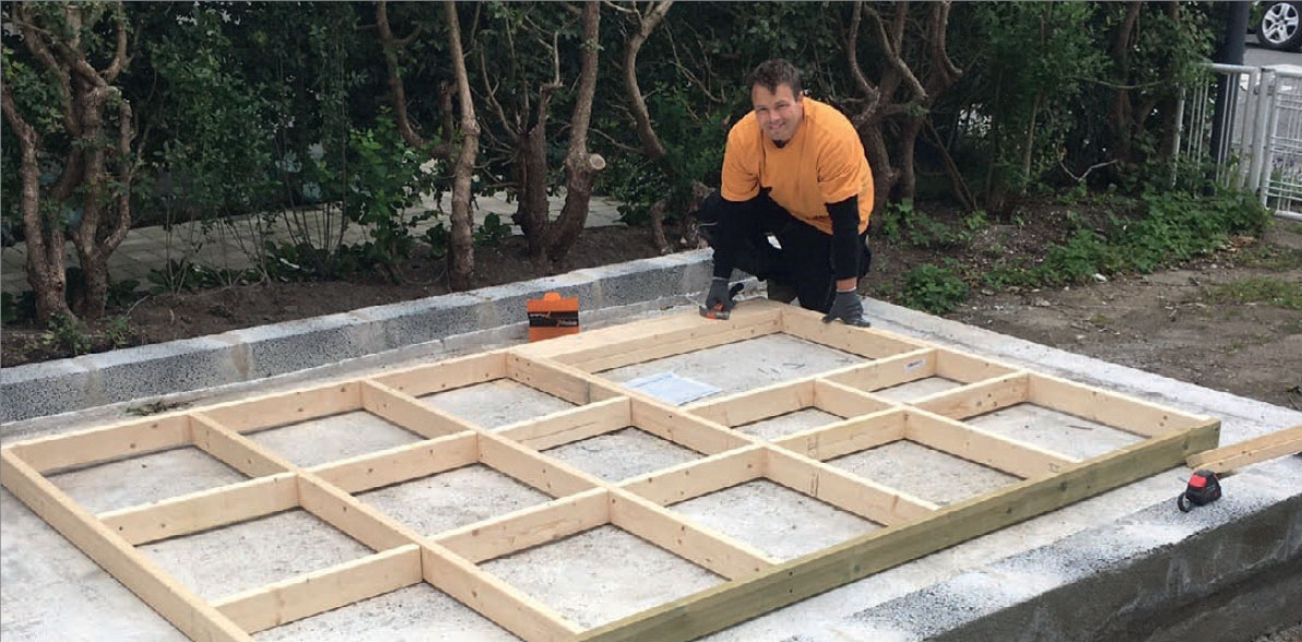 Skal du bygge en bod eller en garasje, er det ingen grunn til å bygge veggene “stående”. Ved å sette dem sammen mens de ligger på et plant underlag, er du sikker på at lektene ikke forskyver seg fra hverandre. Og når du først har laget én side, kan du la den ligge og bruke den som mal for den neste.