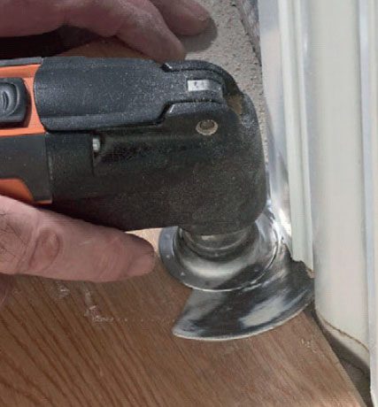 Legger du et nytt gulv oppå et eksisterende, er du nødt til å kappe en centimeter eller to av karmlistene for å få plass til det siste gulvbordet. Til det bruker mange en listesag. Vil du gjerne gjøre det raskere og slippe å ligge og sage for hånd i gulvhøyde, er det opplagt å bruke en multikutter med et segmentsagblad beregnet til tre i stedet.
