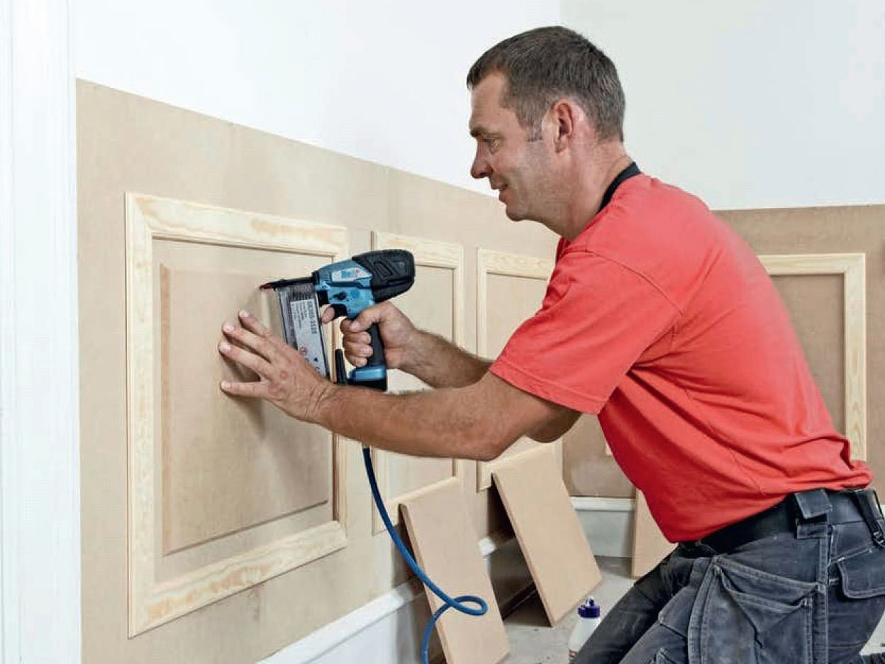Vil du skru opp nivået på herskapeligheten, kan du lage brystningspanel. Begynn med å lime en MDF-plate på veggen i den høyden du ønsker. Deretter skyter du fast fire lister på MDF-platen, slik at de danner en fin ramme. Til slutt skyter du fast en spesiell topplist, som er laget til formålet. Deretter er det bare å finne frem høyglansmalingen og male.