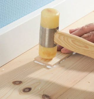 Tegn først opp etter lusen. Stem hele veien rundt med et stemjern. Snu den flate siden utover, slik at kanten blir loddrett. Lusen skal være halvparten så tykk som gulvet. Så her må du stemme et 15 mm dypt hull i de 30 mm tykke gulvbordene.