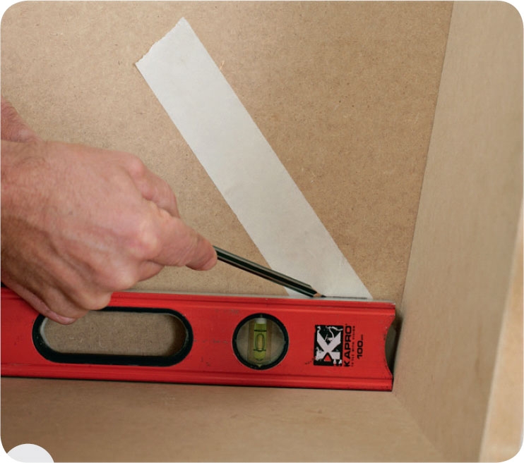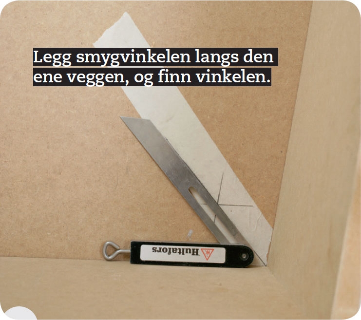Strek opp på teipen ved å legge et vater langs begge veggene. Du slår streker som ”flytter” vinkelen i hjørnet ut på teipen.