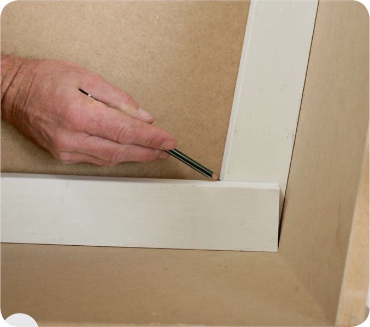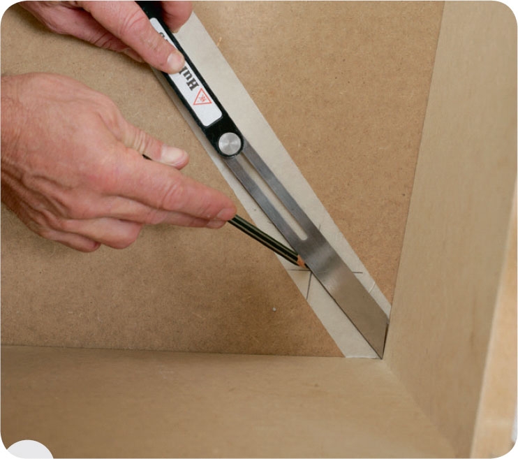 Overfør vinkelen til listen. Legg smygvinkelen så den faste siden flukter siden på listen. Strek opp langs bladet. Gjør det samme på den andre listen.