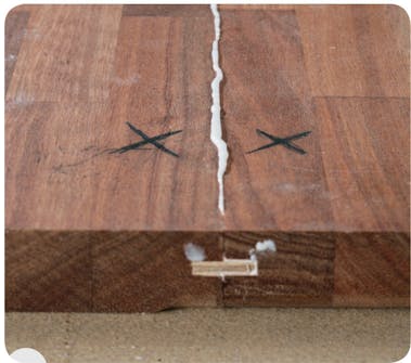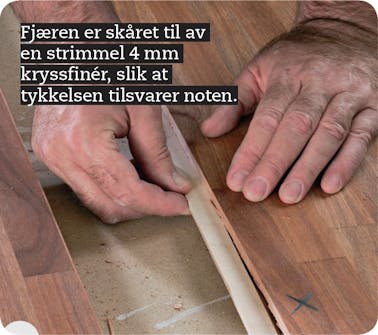Kontroller dybden på noten. Skjøten skal være helt tett, kant mot kant. Derfor skal fjæren skal være litt smalere enn dybden på de to notene. Her er sammenlagt dybde 20 mm, fjæren er 18 mm bred.