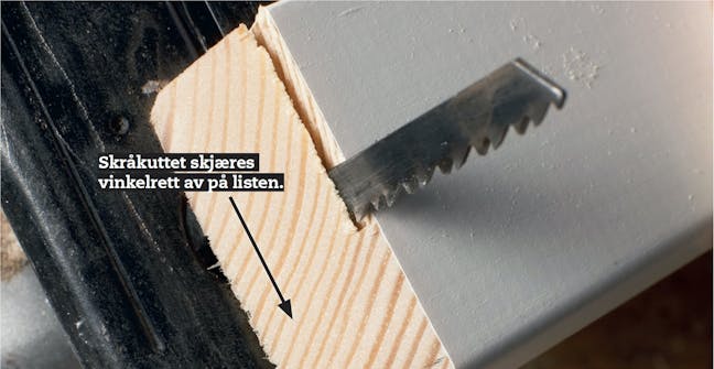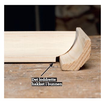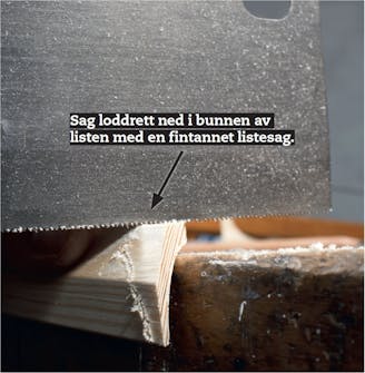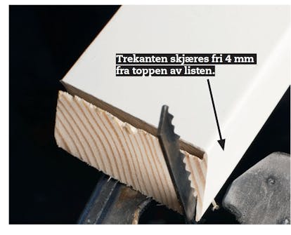 Skjær inn fra enden, slik at du får et trekantet “lokk” i overkanten av listen. Lokket skal være cirka 4 mm tykt. Blir det for tynt, risikerer du det knekker.