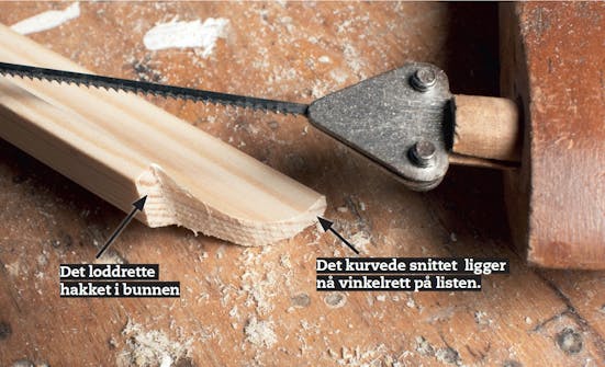 Snu listen rundt, og sag loddrett ned til kurvesnittet. Da får du det hakket som du kan se i bunnen av listen på bilde 3 og 4.