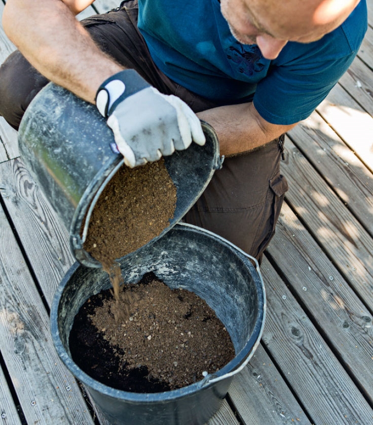 Har du litt sand eller fin grus til overs, er det bare å kjøpe en pose jord og sette i gang. Blandingen lages i forholdet 1:1, og mens jorden har til oppgave å holde på fuktigheten, sørger sanden eller grusen for at jorden ikke blir for kompakt. Avrettingssand er glimrende til formålet.