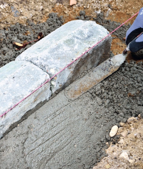 Ønsker du en synlig kantsikring rundt en belegning, bør du bygge opp den som det første du gjør – i motsetning til en usynlig kantsikring, som etableres til slutt. Kantsikringen består av stein eller blokker satt i betong, slik at de hindrer belegningen i å skli ut i siden under belastning.