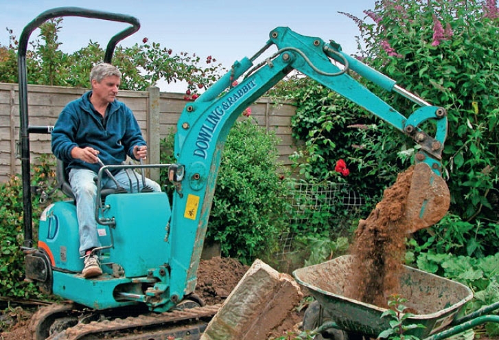 3. Lei en minigraver og skån ryggen når du skal grave ut til en ny terrasse eller til en innkjørsel. En terrasse på 20 m² krever normalt at du graver vekk noe sånn som 7 m³ jord. Det er derfor raskere og mer skånsomt å leie en minigraver enn å finne frem spaden. Lei eventuelt også en kontainer.