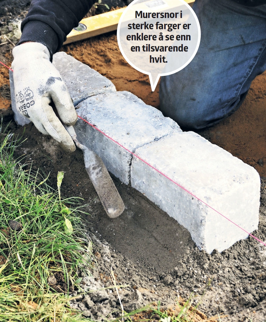 I stedet for å legge belegningen etter et rett bord eller en rettholt, kan du trekke en murersnor mellom to påler. Fordelen ved denne metoden er at du kan markere retningen og høyden på belegningen samtidig. Sørg for at snoren sitter 2-3 mm over belegningen, slik at det er luft mellom den og steinene.