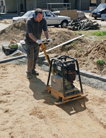 Platevibratoren banker nemlig grusen mye bedre sammen hvis den er fuktig. Årsaken er at vannet smører kornene, slik at grusen pakker seg i stedet for bare å støve. Tre overkjøringer med en tung platevibrator pleier å være nok.