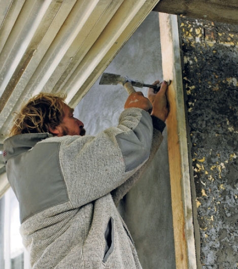 Slipper mørtelen på hjørnet når du pusser en vegg, kan du med fordel spikre eller skru fast et bord midlertidig. Det gir deg noe å pusse mot, og det gjør det mye enklere å styre pussmørtelen.
