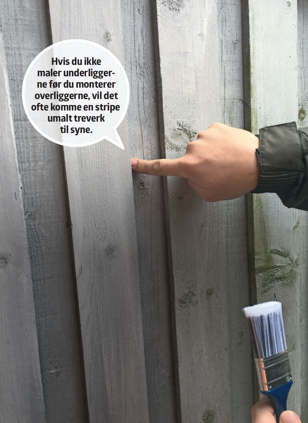 Hvis du kler veggen med stående kledning, såkalt tømmermannskledning, vil det lønne seg å male underliggerne før overliggerne spikres på. Maler du først etter at du er ferdig, vil smale striper med umalt treverk med stor sannsynlighet dukke opp når treverket krymper ved tørking.