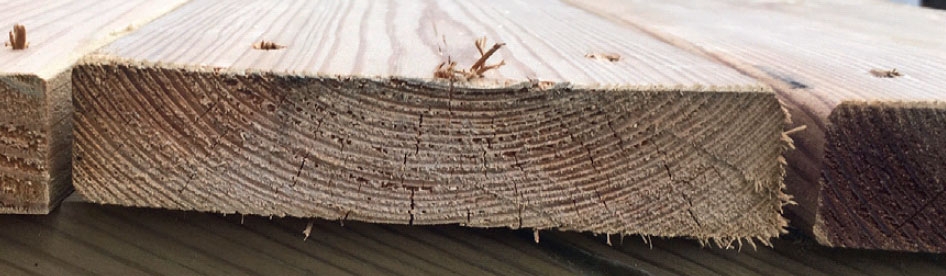 Når du legger terrassebord, skal margsiden vende opp, så sant det er mulig. Margsiden motstår nemlig vann bedre. Hvis du ser på enden av bordet, og årringene “smiler”, ligger margsiden opp.