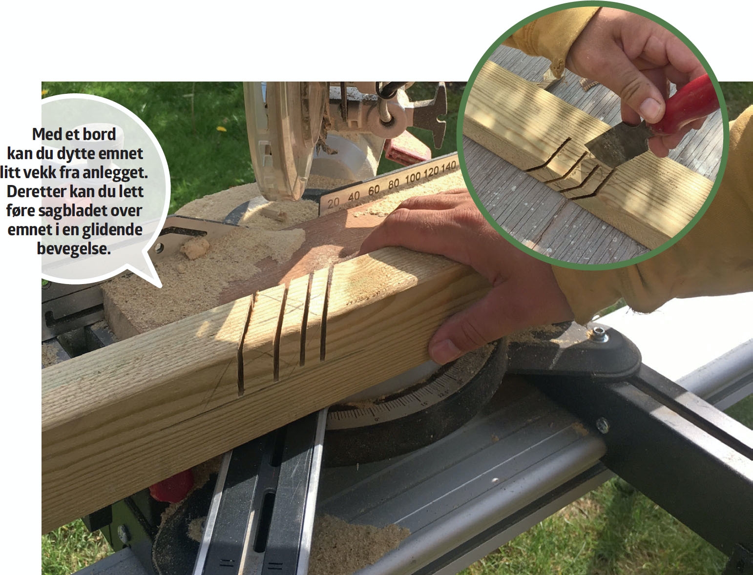 Skal du stemme ut til et “kryss” i gjerdet eller en solid bjelkeskjøt, er det hardt arbeid hvis du kun har hammer og stemjern til rådighet. Metoden har riktig nok fungert i århundrer, men hvorfor ikke skru opp hastigheten og presisjonen med en kapp-/gjærsag? Ved å lage 4-5 snitt med samme dybde, kan du raskt stemme vekk overskytende treverk. Og ikke nok med det: Kappsagens presisjon gjør det mulig å lage snorrette snitt, slik at du kan få sammenføyningene til å passe helt nøyaktig - selvsagt med forbeholdet om at du måler opp riktig!