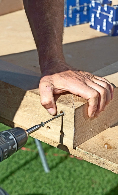 Når du skal sette sammen to treemner i en vinkel, er det viktig at du skrur forsiktig. Da reduserer du risikoen for at det ene emnet glir vekk fra det andre. Skru først skruene litt inn, mens du passer på at sammenføyningen ikke forskyves, og skru dem deretter i bunn.