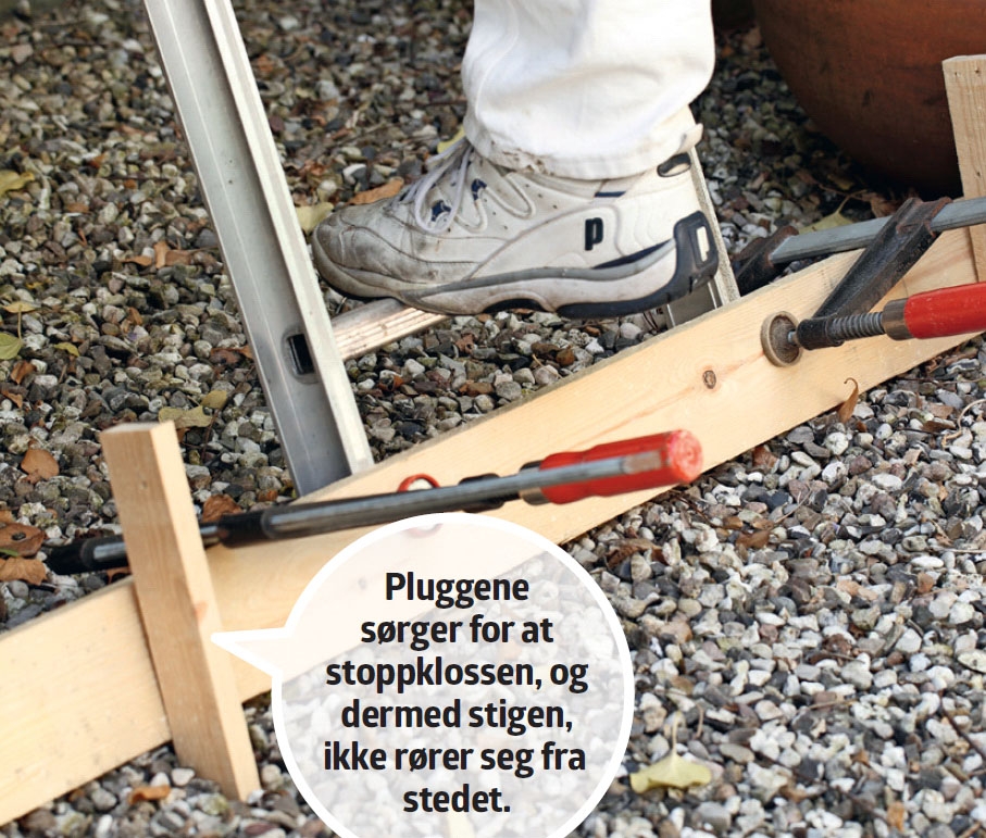 Noen mener at det er både nervepirrende, og uansvarlig å rense takrenner uten at noen holder på stigen. Jobber du alene, kan du derfor med fordel lage en “stoppkloss” til stigen. Den kan bestå av et bord som er montert på to lekter, som fungerer som plugger. Selve anordningen spennes fast til stigen med to kraftige skrutvinger. Deretter kan du med ro i sjelen ta deg en tur opp til takrennen.