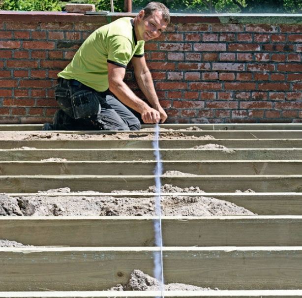 Hvis du skrur fast terrassebordene ovenfra, så bruk en krittsnor eller et vater til å markere hvor skruene skal sitte. Det ser ganske enkelt bedre og mer profesjonelt ut når skruene flukter med hverandre.
