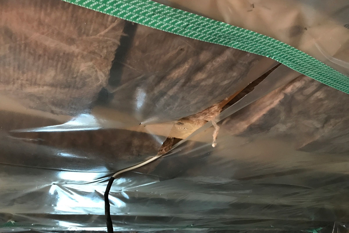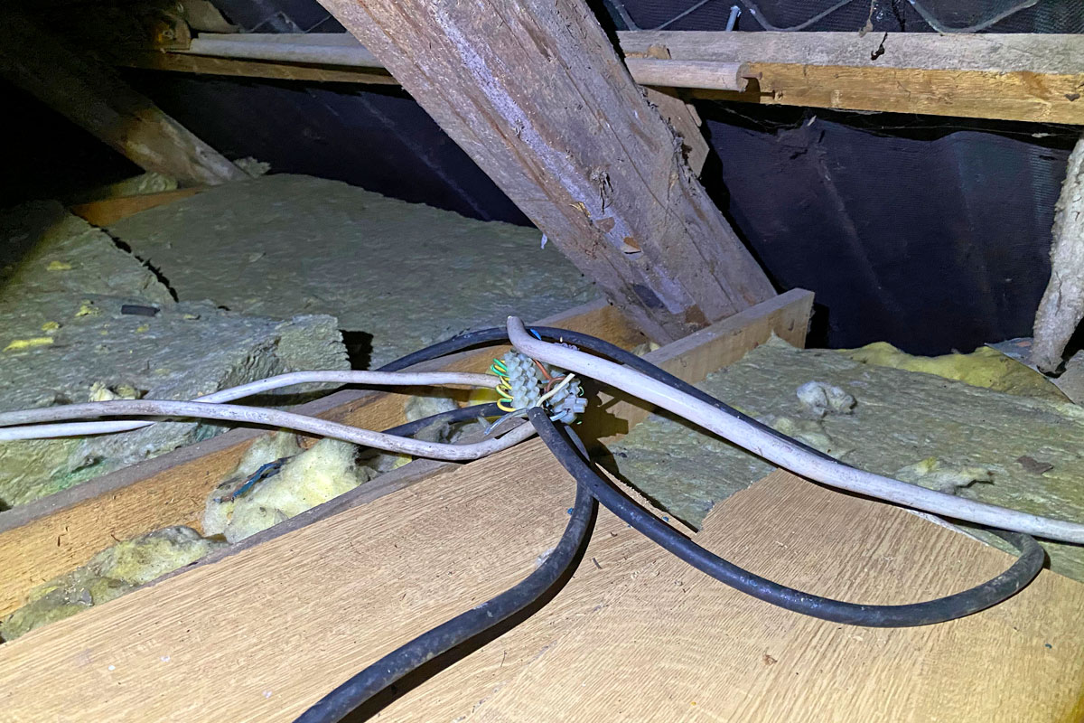 Her har det tydeligvis vært behov for å forlenge en ledning og trekke den gjennom dampsperren. Det er noe du gjerne kan gjøre, men bare ikke så slurvete som her.