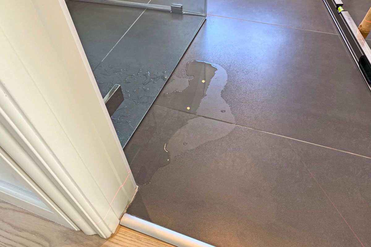 Dette har den rådgivende byggingeniøren sett flere ganger enn han kan telle: Fallet på gulvet på badet er helt feil. Det skal renne ned i sluket i dusjen til venstre for vannpytten. Men i stedet renner vannet ut av dusjen og legger seg foran døren.