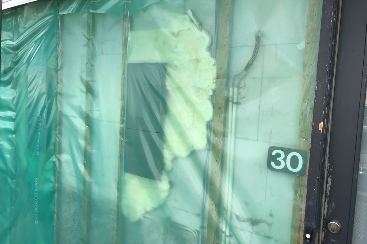 Fugeskum kan brukes mange steder, men ofte er det en bedre idé å la være. Her har noen for eksempel tettet et hull i en vegg med store mengder fugeskum - det ser faktisk ut som om en strømtavle er satt fast med skum.