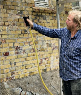 Vann veggen. Vannet skal fjerne det siste støvet og mette muren helt. Sement herder med fukt, og pussen skal ikke tørke for raskt.