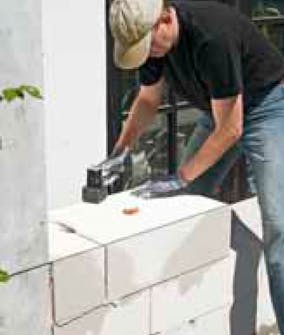 Det er bare den første rekken blokker som skal legges i tradisjonell mørtel. Her er det viktig at du har mørtel nok til at rekken kan rettes opp i vater. De øvrige blokkene limes sammen med eget lim for porebetong (tynnfugelim). Det gir ikke de store mulighetene for å rette opp på eventuelle skjevheter senere.