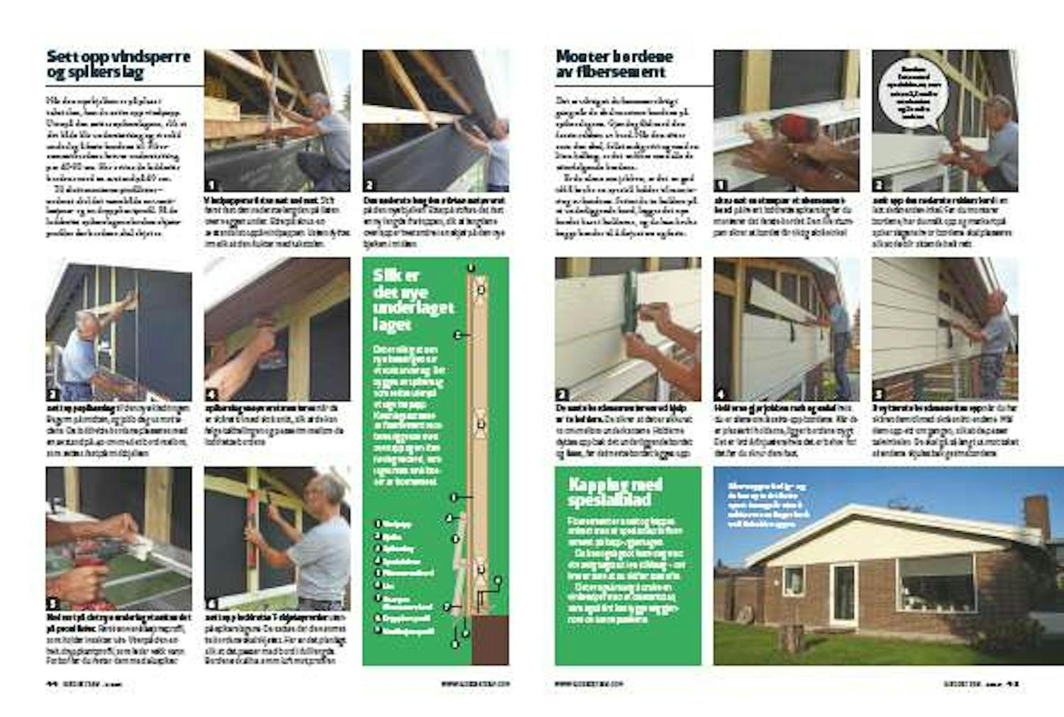 Når den nye bjelken er på plass i takstolen, kan du sette opp vindpapp. Utenpå den settes spikerslagene, slik at det både blir understøtting og et solid underlag å feste bordene til. Fibersementbordene krever understøtting per 40-60 cm. Her settes de loddrette bordene med en avstand på 40 cm.